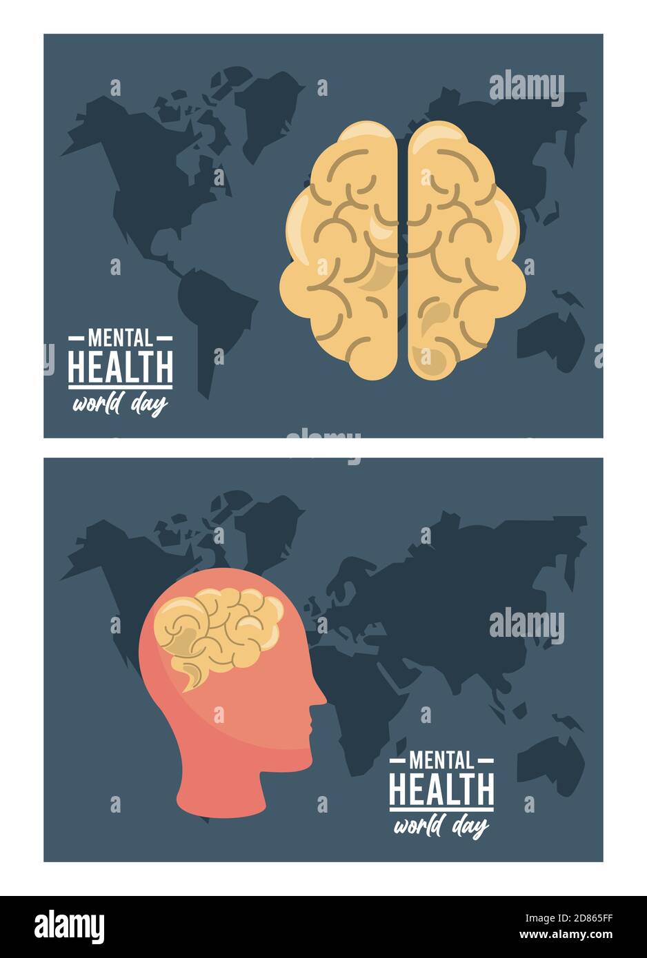 World Mental Health Day Campaign With Brain Profile And Maps Earth Vector Illustration Design Stock Vector Image Art Alamy